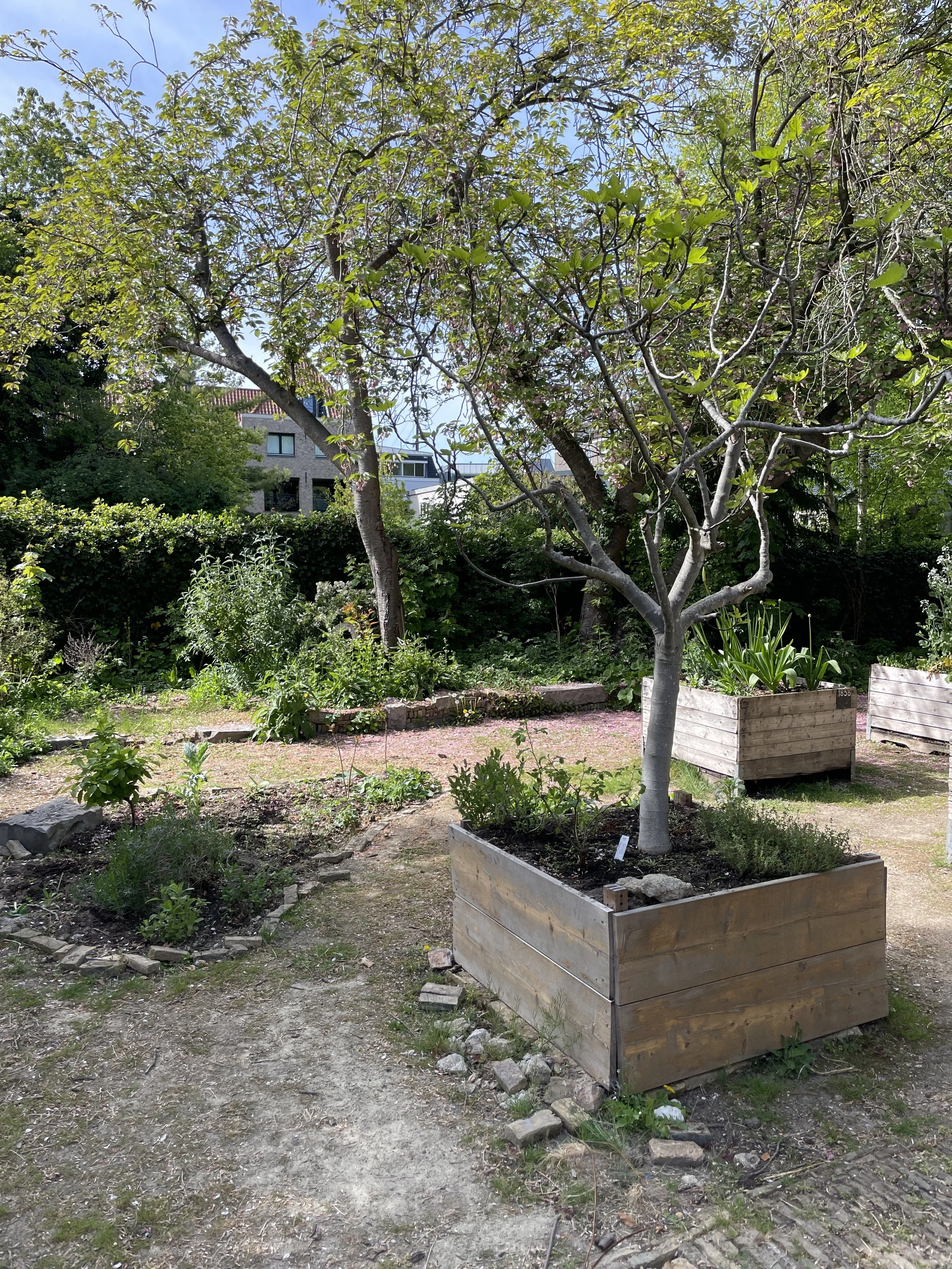 The sunny, sheltered heart of the Silent Garden at Food Design Playground with the fig tree at the centre. Around it: the Palestinian heritage beds, planted with za'atar, nigella, lathyrus, sumac, mallow, cardoon, plum tree. And more to come.